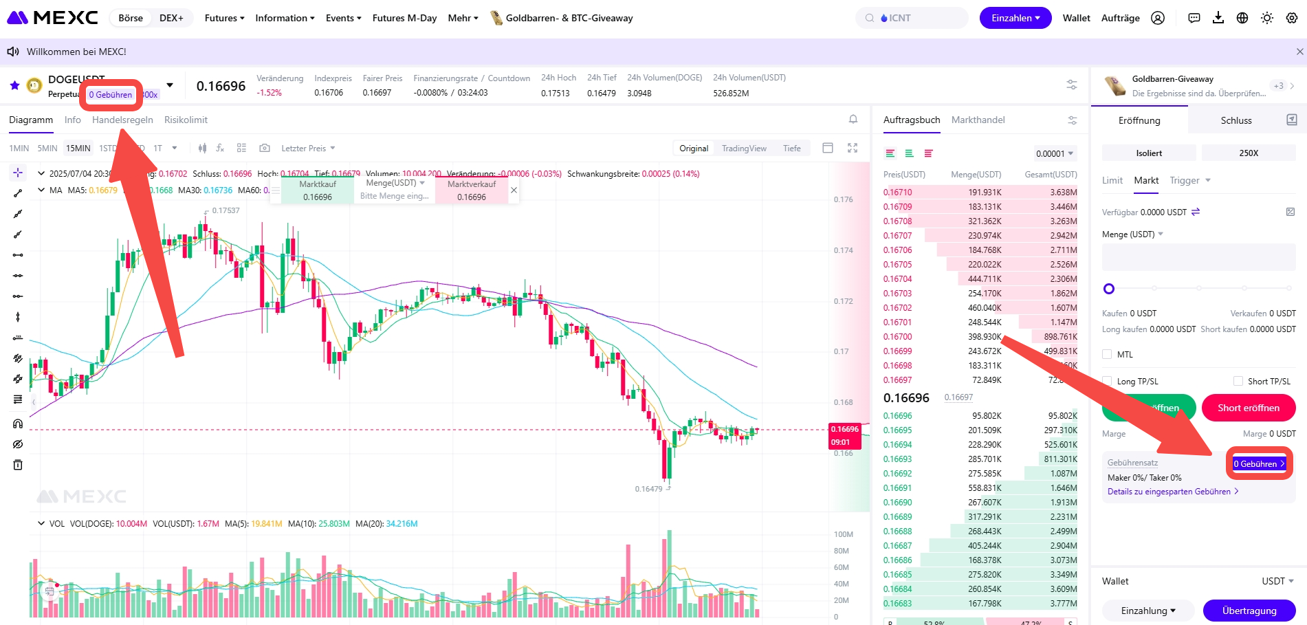 Nach dem Anmelden wechseln Sie zur Futures-Handelsseite. Dort finden Sie das Label „0 Gebühren“ direkt unter dem Handelspaar oder den Abschnitt „Gebührensatz“ in der rechten unteren Ecke.