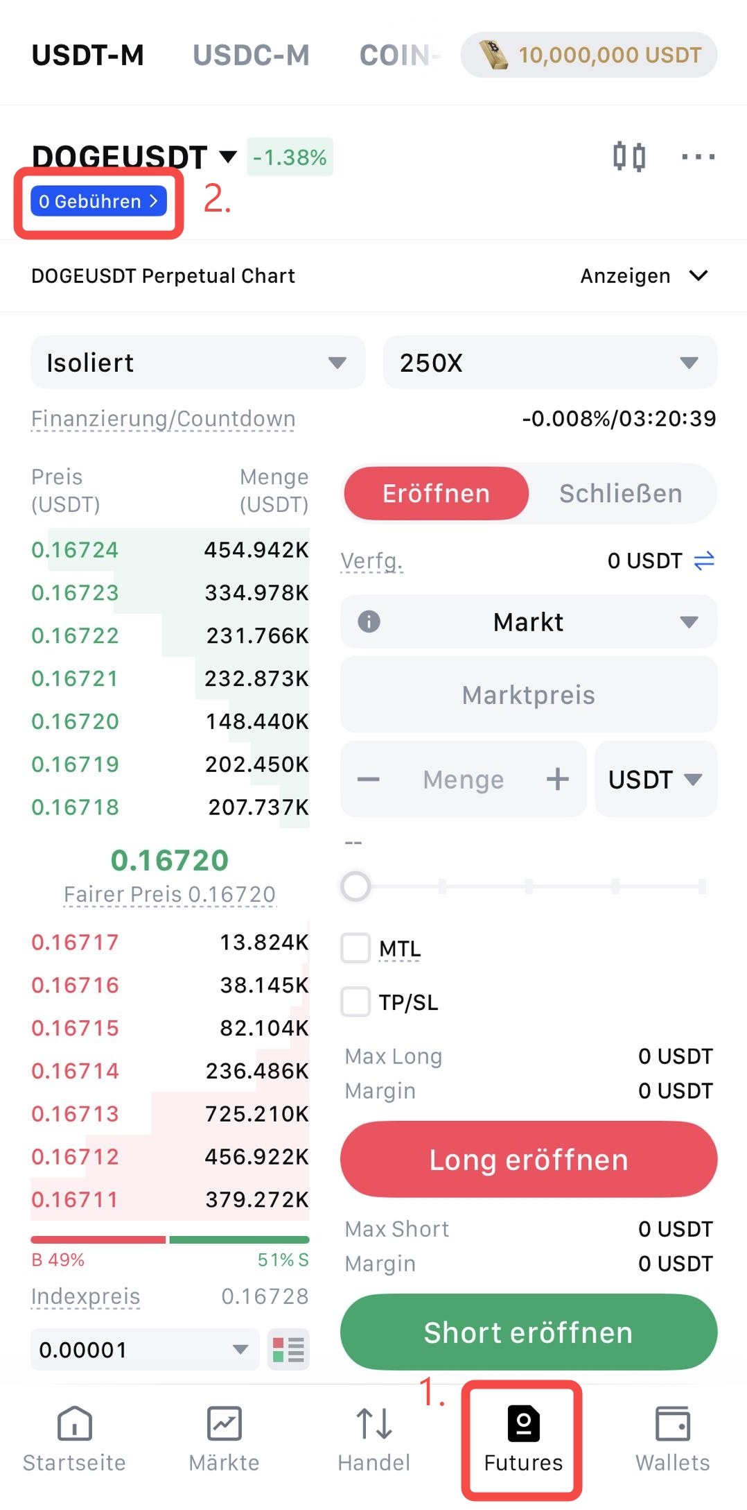 Tippen Sie im Menü auf „Futures“ und suchen Sie nach BTC-Futures-Paaren. Prüfen Sie, ob sich direkt unter dem Handelspaar das Label „0 Gebühren“ befindet.