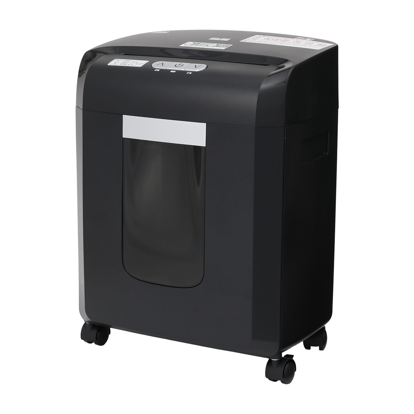 bonsaiiの「電動シュレッダー C237-D」は、ホチキスやクリップがついた紙もスピーディに細断したい人向きです。束になった書類をそのまま細断できるのは便利。投入口までのガイドは30.0mmと長めで紙を挿入しやすいのに加え、センサーで紙を検知するため、紙をセットするだけで自動で細断がスタートします。細断スピードが速いのも魅力。検証したところ30枚あたり37秒しかかからず、一度に最大5枚まで投入できました。連続で使用できる目安時間は4分ですが、ある程度量のある書類を処分する際も効率よく作業できるでしょう。一方で、クロスカットを採用していることもあり、肝心の細断サイズはいまひとつ。細断後は1片が短辺が平均5.15mm・長辺が平均19.86mmで、紙に記載してある文字の大きさによっては読み取れる可能性があります。情報の漏洩を確実に防ぎたい人には向かないといってよさそうです。ダストボックスの上にフタをかぶせるタイプで、引き出し式に比べるとゴミを捨てるとき周囲が散らかりにくいでしょう。ただし、ダストボックスの容量は13.0Lと大きめですが、クロスカットサイズでゴミがかさばりやすい点には注意してください。細断速度や投入のしやすさは申し分ない商品。しかしながら、情報の復元しにくさという点では万人におすすめしにくい印象です。