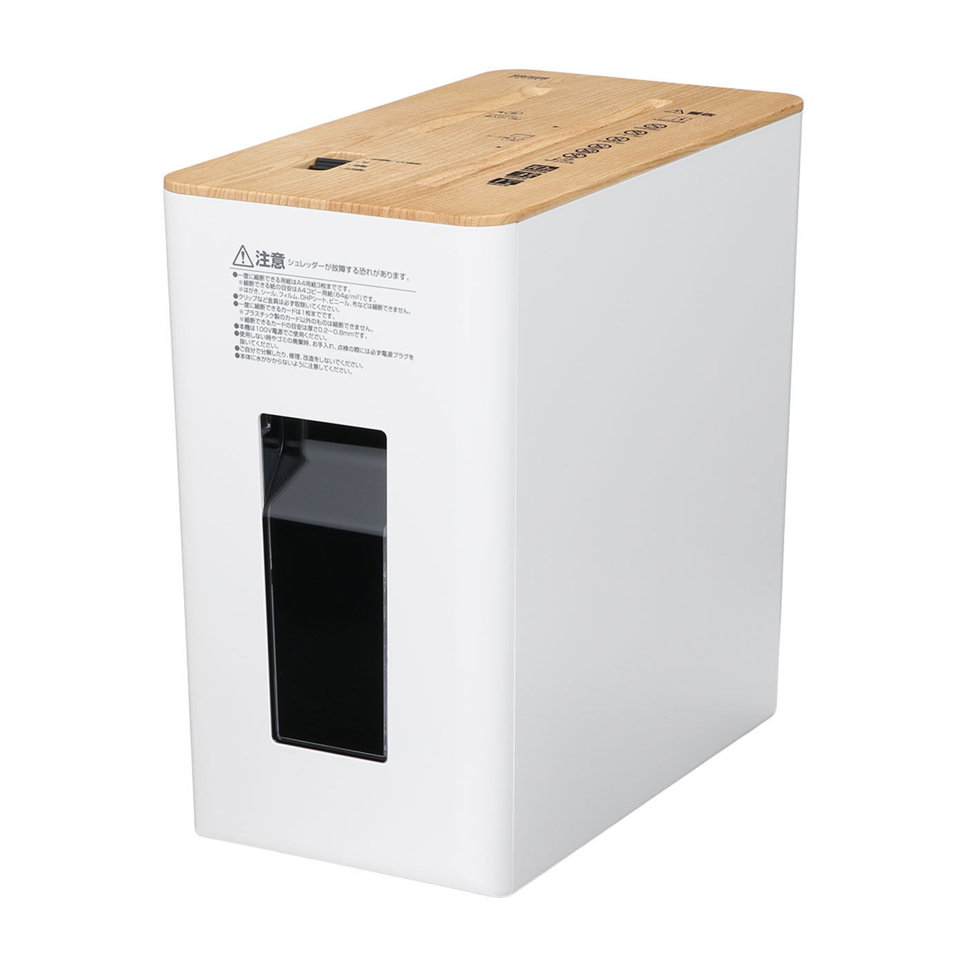 サンワサプライの「静音シュレッダー 400-PSD063」は、細断後の細かさにこだわりたい人におすすめです。細断サイズは、検証したなかでもトップクラス。短辺が平均1.68mm・長辺が平均8.98mmと非常に細かく、小さめの文字はほぼ読み取れないレベルでした。情報の復元をしっかりと防止したい人に向いています。センサーで紙を自動検知するため、紙をセットするだけで細断をスタートし、終わると自動で停止するのもメリット。クレジットカード・CD・DVDなどのメディアに対応している点も魅力です。投入口までのガイドの長さは15mmと長めで、比較的紙をスムーズに入れられるでしょう。マイクロカットでゴミがかさばりにくいのも利点です。ダストボックス内にはCD・DVD専用トレーがあり、細断したものを分別可能。一方で、引き出し式であるため捨てる際にゴミが散らばりやすい点には注意が必要です。また、検証では30枚あたり88秒かかり、細断スピードの評価はいまひとつ伸び悩みました。連続使用時間は10分と比較的長いものの、一度に投入できる最大枚数は3枚と少なめ。1回投入するごとに待ち時間が発生するので、大量の紙をまとめて処理したい人には向きません。天板が木目調でデザイン性が高い点は魅力。待つのが苦手な人には向きませんが、とにかく細かく細断したい人は候補に入れるのもよいでしょう。