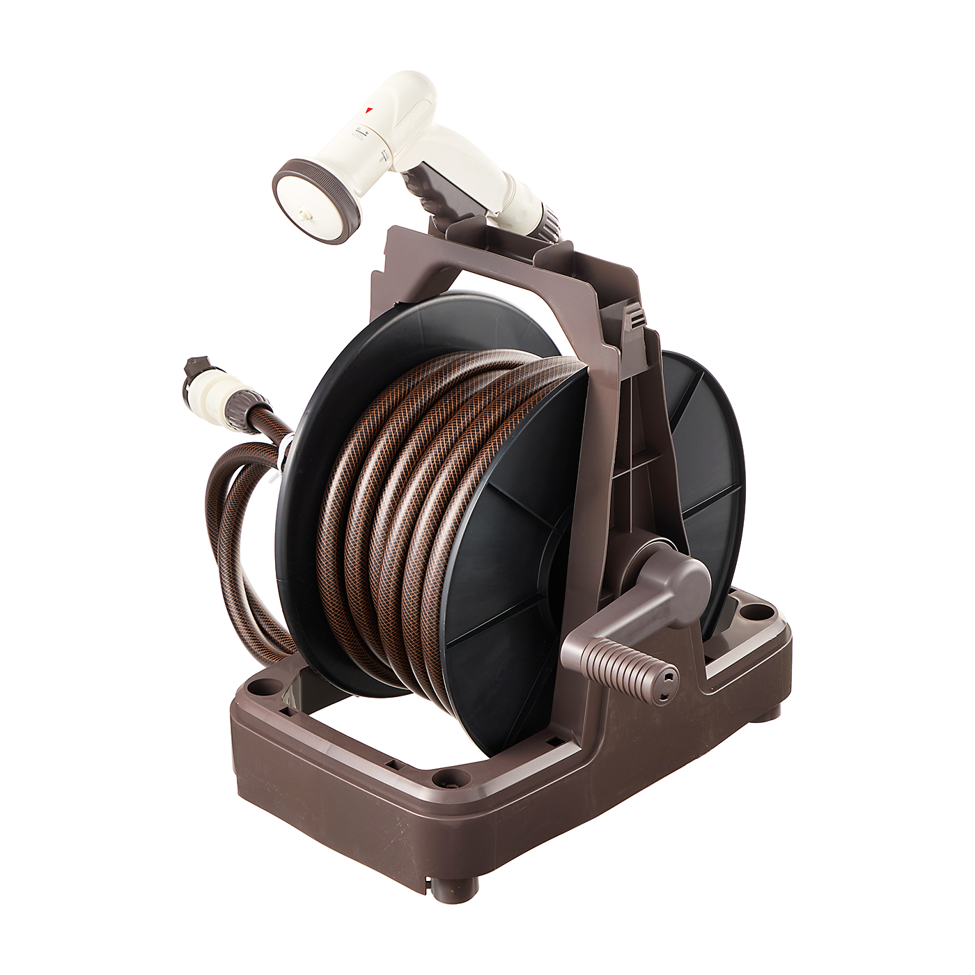 タカギの「ホースリール RM220FJ」は、植物の水やりだけでなく、家の周りの掃除用途にも使いたい人におすすめです。20mのホースのなかでは水圧が平均0.06MPaと高いうえ、コンパクトで取っ手もあるため持ち運びやすいといえます。散水パターンは、ジェット系・シャワー系・霧系・ジョロと非常に充実しており、無段階調整も可能です。庭の水まきから家周りの掃除まで、幅広い用途で活躍するでしょう。取りつけは完全ツールレスなので気軽にでき、蛇口給水栓のアタッチメントもついています。巻き取りに使うハンドルはかなり小さめで握りづらい印象。ねじれはほぼなく軽い力で巻き取れましたが、モニターからは「ホースに若干の重さを感じた」という声が挙がっており、上位の商品と比較すると片づけしやすいとはいえません。モニターが実際に使ったところ、トリガーが小ぶりで評価が割れました。小さめの手の人には使いやすいものの、手の大きさによっては握りにくさを感じることもありそうです。モニターからは「持ち手が短く、手が滑ると落としそう」との声も。なお、トリガーは引ききるのに力が必要ですが、ワンクリックで通水・止水を切り替えできるので、握り続ける必要がない点は便利です。20mと長めのわりにはコンパクトなうえ、散水パターンが豊富で、さまざまな用途で活躍する1台。ただし、トリガーの握りやすさは好みが分かれるため、手が大きい人は注意しましょう。