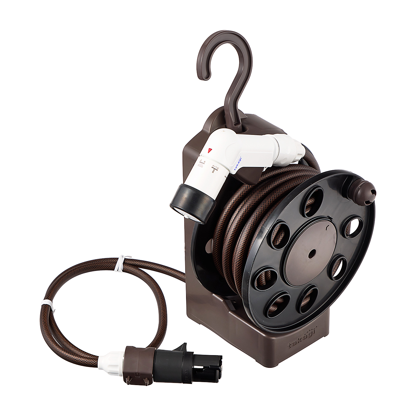 タカギの「オーロラLIGHT R1410BR」は、持ち運んで使用することが多い人におすすめです。重量1.62kgと軽量かつコンパクトにまとまっており、楽に持ち運びできます。また、フックがついているので地面に置かず浮かせて収納できる点もうれしいポイントです。散水パターンはジェット系・シャワー系・霧系・ジョロと基本的なものがそろっているため高評価。水圧の高さは平均0.04MPaと控えめなものの、散水には十分です。ただし、巻き取りの際に若干ねじれることもあり、片づけには手間がかかる印象です。引っかかる感じはなかったものの、細めのホースで短いわりには巻き取りに重さも感じました。トリガーの持ち手が短く、疲れにくさの評価はモニターによって割れる結果に。手が小さめのモニターには持ちやすく好評だったものの、一部のモニターからは「握ると指が余って違和感がある」との声もあがっています。しかし、握るとカチカチとトリガーを固定できて、操作性自体はよいといえそうです。握りにくさはやや気になるものの、軽量でコンパクトなホースリールであり、使い勝手のよさも備えています。手がそれほど大きな人でなければ、ベランダと庭を行き来しての水やりなど、とくに持ち運んで使うシーンで重宝しそうです。