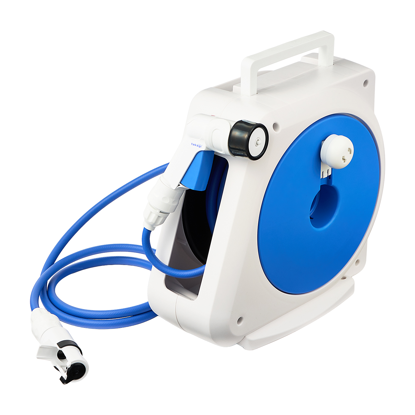 タカギの「マーキュリーⅡツイスター RT215TNB」は、毎日の植物への水やりに使いたい人におすすめ。安定感のあるデザインで、シンプルな使いやすさが魅力です。散水パターンを確認すると、使い勝手のよいジェット系・シャワー系・霧系など豊富に用意されていました。水圧は平均0.05MPaとパワーも十分です。完全ツールレスで取りつけできる点でも評価されており、工具を使わず簡単に設置できる点は大きなメリット。蛇口給水栓のアタッチメントもついていますよ。モニターが使ったところ、トリガーは軽い力で操作でき、固定もできました。固定から解放する際のボタン操作も簡単で、細かな調節をしながらの水やりもできそうです。一方で、トリガーの握りやすさには個人差があり、手が小さい人からは「トリガーは太く大きめで手に合わなかった」とのコメントも。手が小さめの人は慎重に選びましょう。片づけの際の巻き取りの操作性も良好です。ハンドルが長めで握りやすいうえ、ホースのねじれも起こりにくく、モニターからは「重さを感じることなくスムーズに巻き取れる」と好評。ただし、ケースは大きめで5.45kgと重さがあります。とはいえ、持ち運びに便利な大きな取っ手がついているので、少しの移動なら問題ないでしょう。大きくて重さもあるため、持ち運ぶというよりは庭・玄関前などで水やりや散水をする機会が多い人に向いています。水圧は十分で散水パターンが豊富なので、掃除や洗車の際にも重宝しそうです。