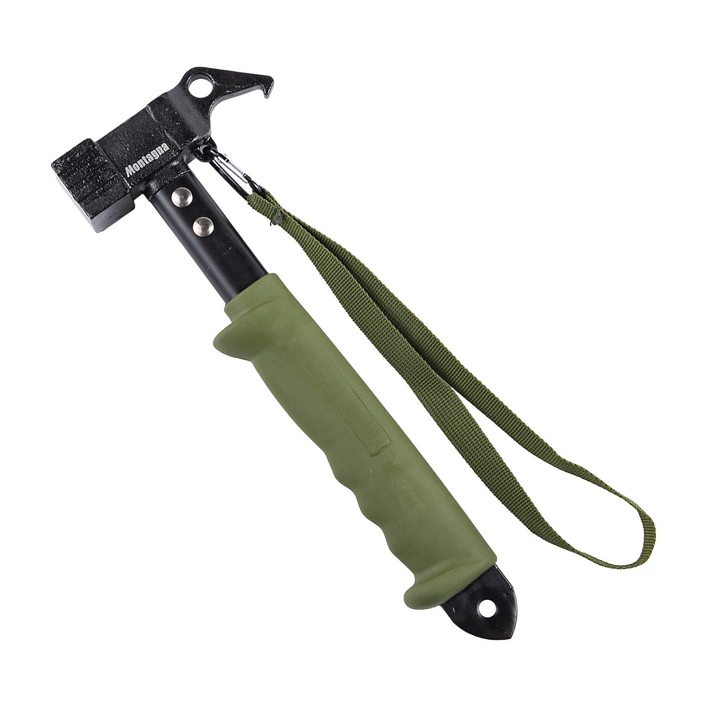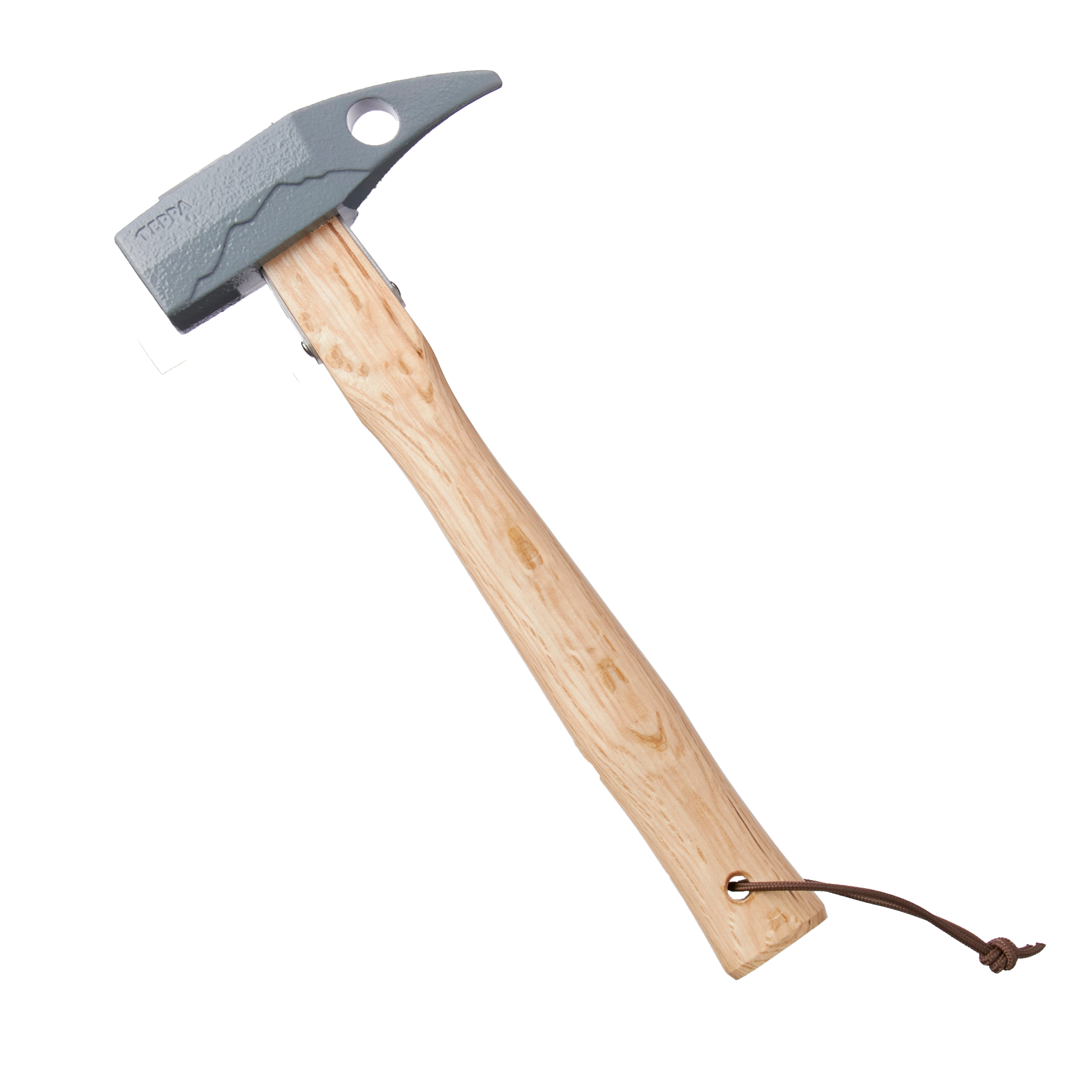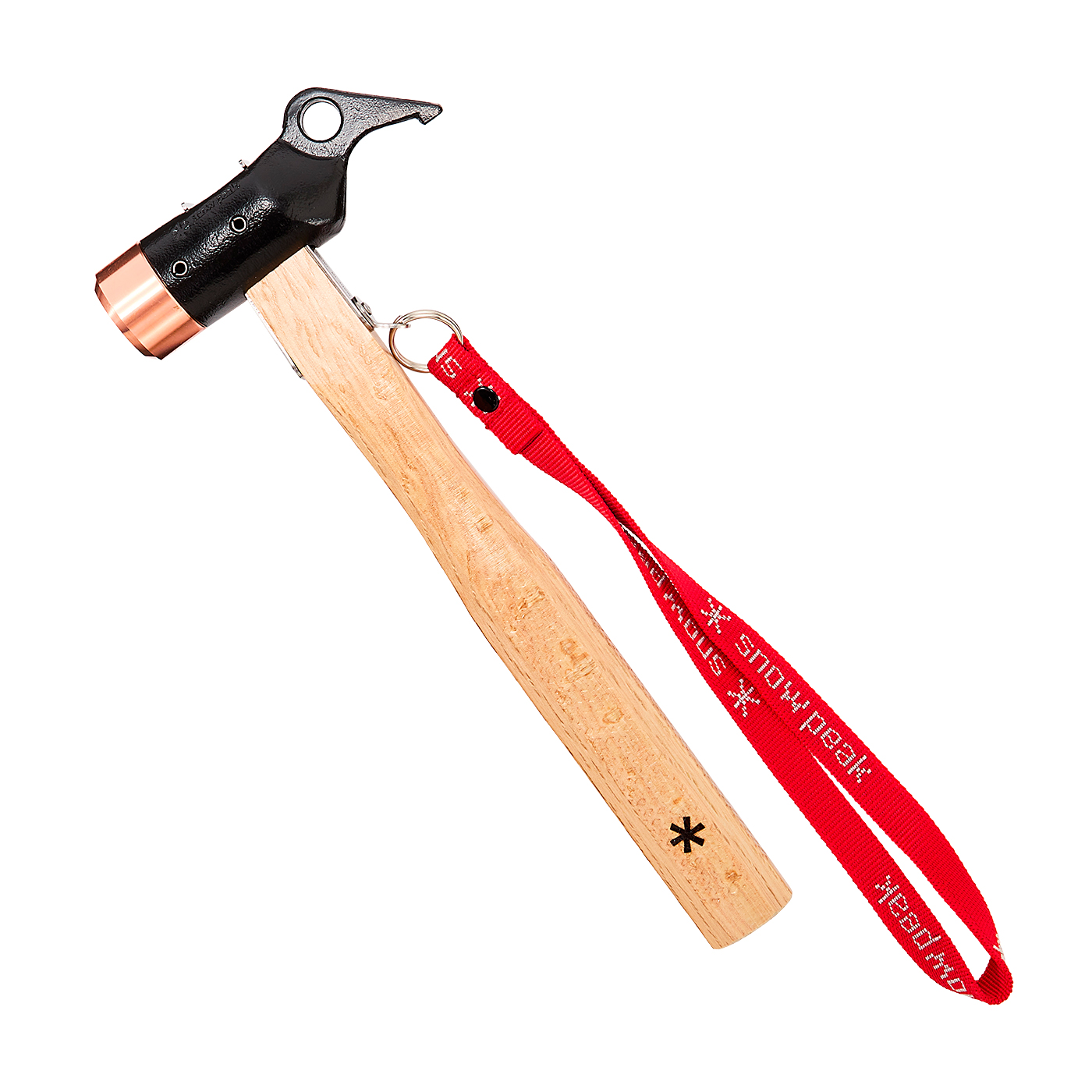 米国カスケードデザイン社の日本総代理店であるモチヅキが取り扱うアウトドアブランド、TEPPAの「TEPPA ベースキャンプハンマー」。ヘッドにダクタイル鋳鉄を使用したハンマーで、ヘッド側面のデザインは新潟県三条市の山、「粟ヶ岳」の稜線がイメージされています。総重量は640gでヘッドに重心があるため、振り上げるときにやや力は必要です。しかし、ペグを打ち込むときは力まなくても十分ペグに力が伝わり、しっかり地面に刺さる感覚を得られました。木製の持ち手はやや滑りやすい印象ですが、手への衝撃がほとんどない点はメリットです。機能性は今回チェックした項目のうち、ホール・フックの2つが備わっていましたが多機能とはいえません。また、フックがやや太く作られているため、使っているペグのホールサイズに合うかどうか確認するとよいでしょう。