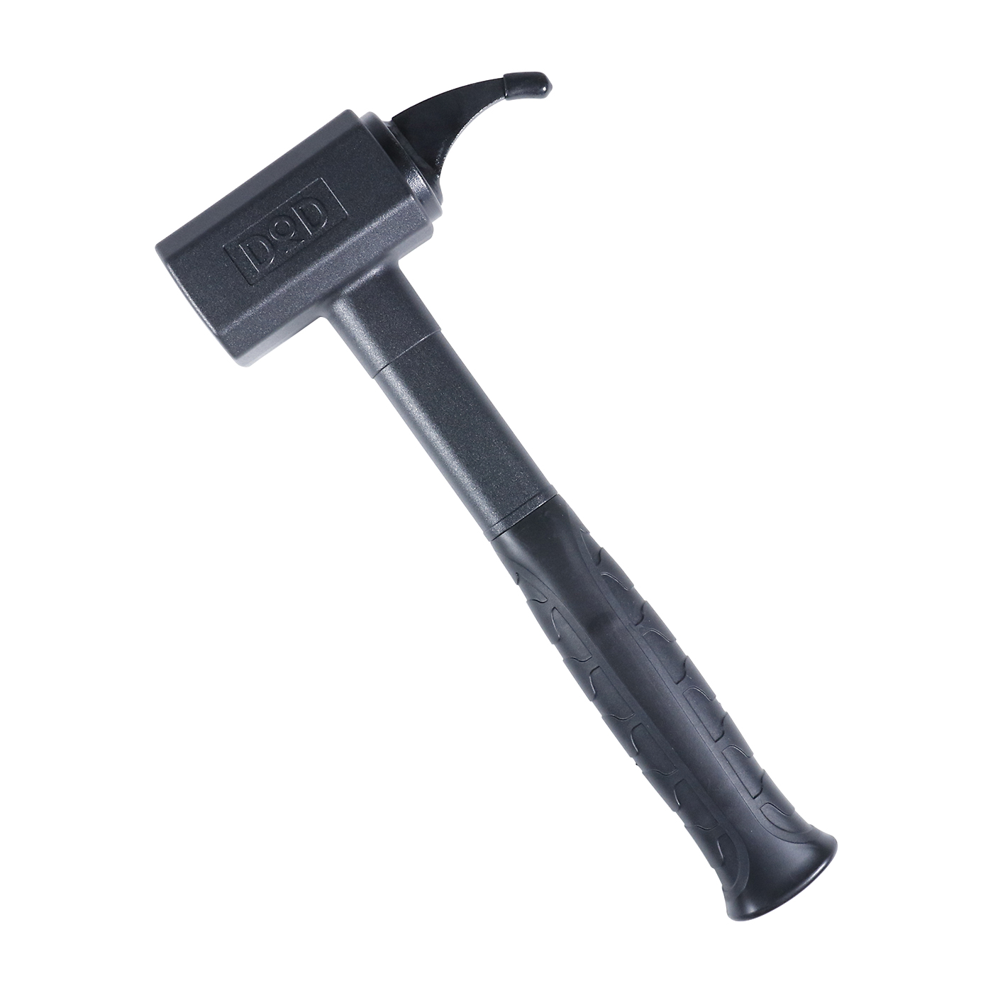 主にアウトドア用品やゲーミング家具などの企画開発を行う、ビーズの自社アウトドアブランド・DODの「シズカナウドーン」。ハンマーの表面を樹脂製にすることで打撃音を最小限にし、夜でも静かに使えると謳っています。総重量は910gとずっしりとした重みがあり、振り上げるときに力が必要でした。ただし、振り下ろす力はほとんど必要なく、ヘッドの重みだけでペグがスムーズに入っていくのが魅力です。また、ヘッドの内部に入っている細かい鉄球が衝撃をうまく緩和し、強く打ち込んでも手への衝撃をほとんど感じませんでした。一方で機能面は、滑り止め加工・フックの2つが備わっていましたが多機能とはいえません。フックの形がやや大きいので、持っているペグの形に合うか確認するとよいでしょう。