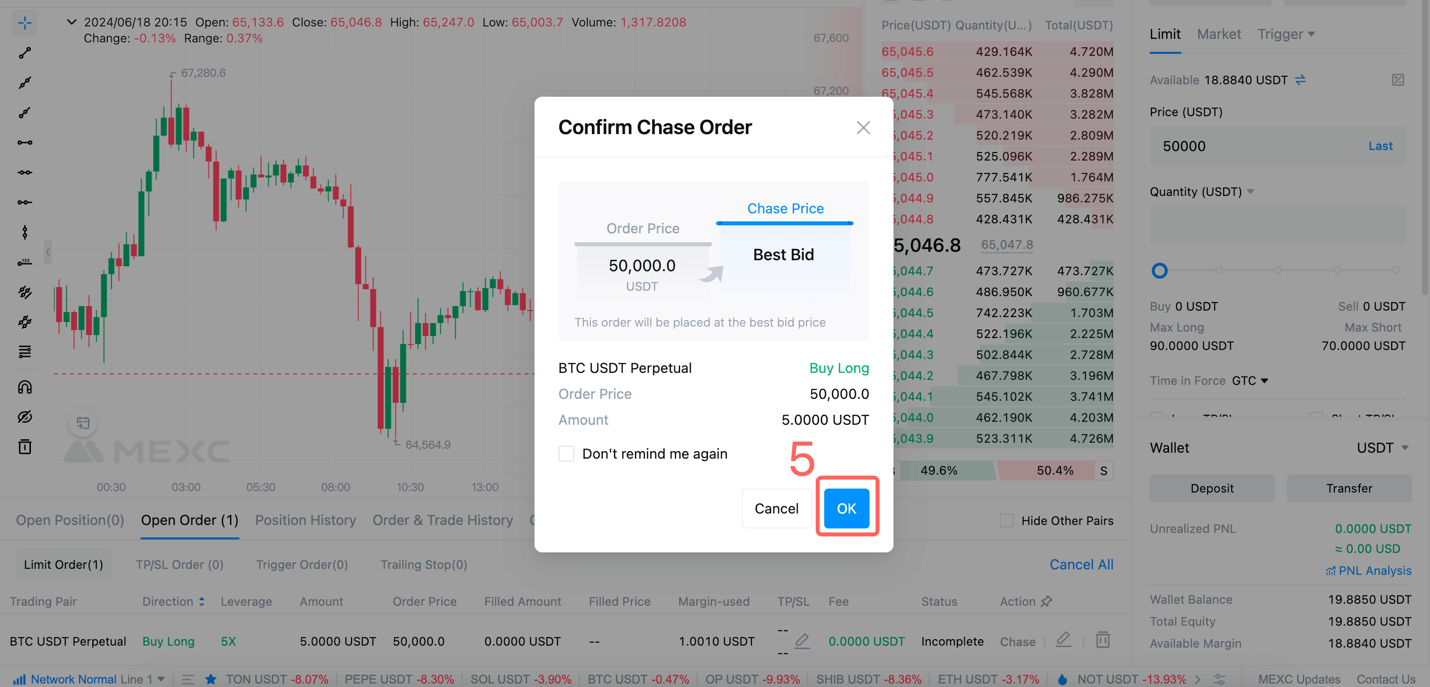 The chase order function resubmits a limit order at the current best market price. Specifically, when a user enables the MEXC Futures chase order, an existing limit order that is far from the order book is quickly adjusted to the best bid or ask, while still remaining a limit order in the Order book. This allows traders to capture opportunities during rapid price swings without resorting to market orders, which typically incur higher fees.