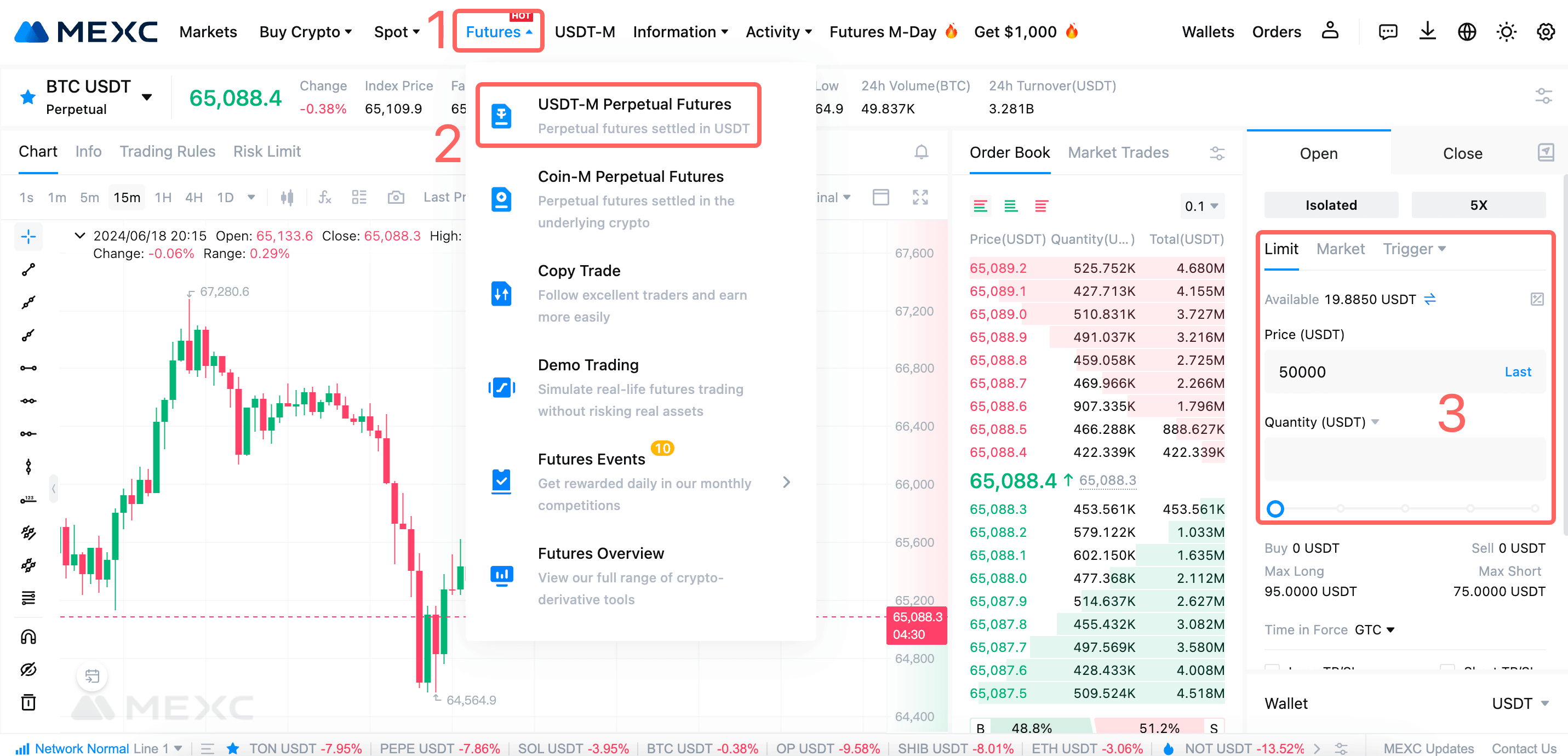 Open the official MEXC website and log in to your account. Under Futures, select USDT-M Perpetual Futures to enter the trading page. In the order placement panel on the right-hand side, create a limit order.