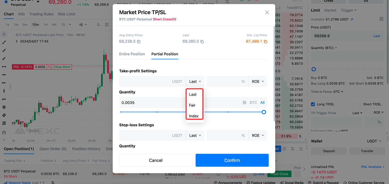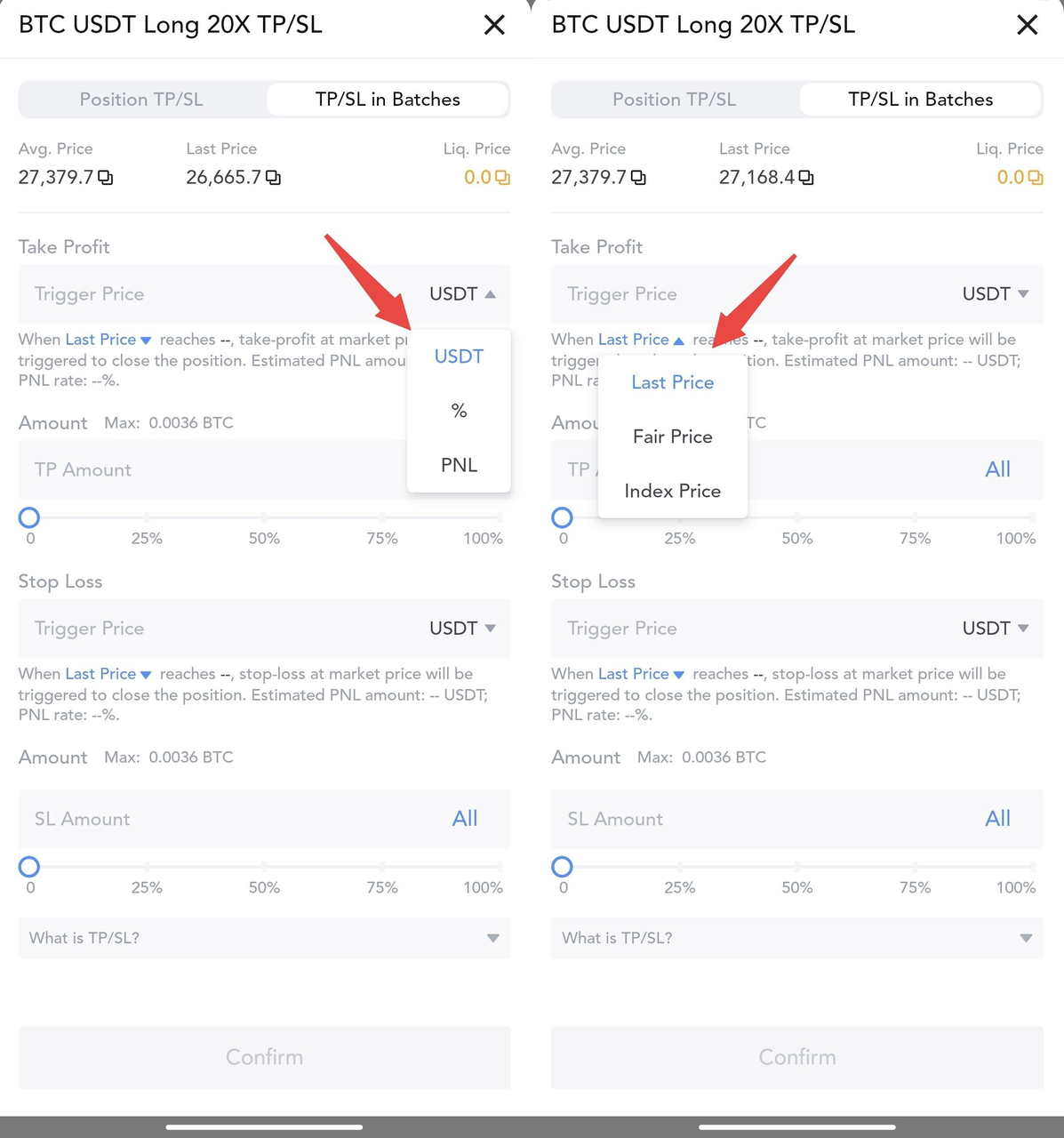 Step 2: In TP/SL Settings, select %, PNL, or USDT and set the Amount, along with Last Price, Fair Price, or Index Price.