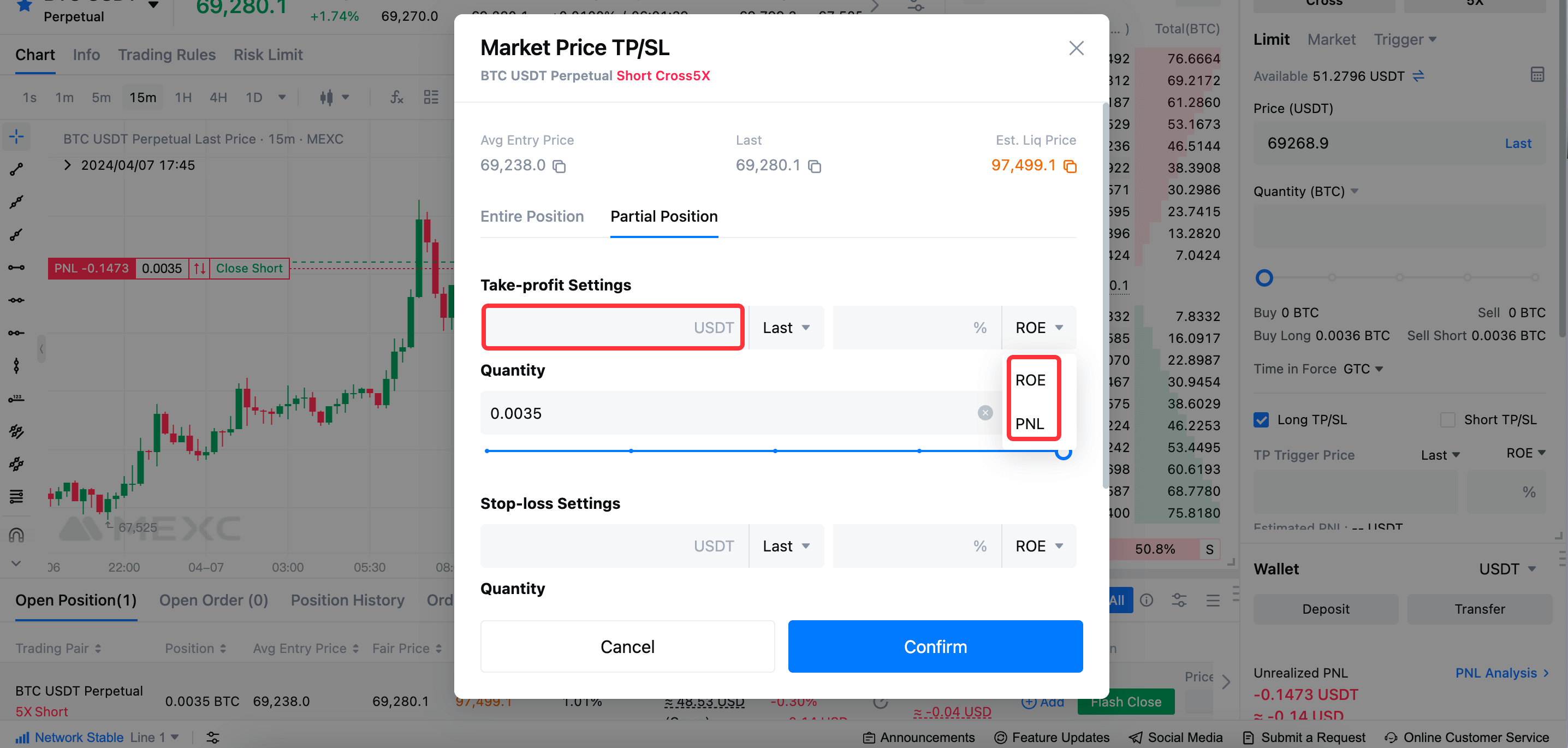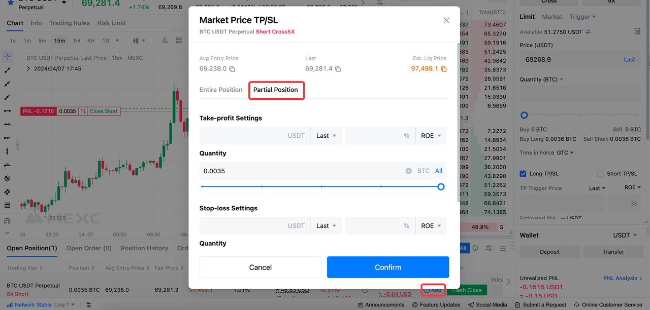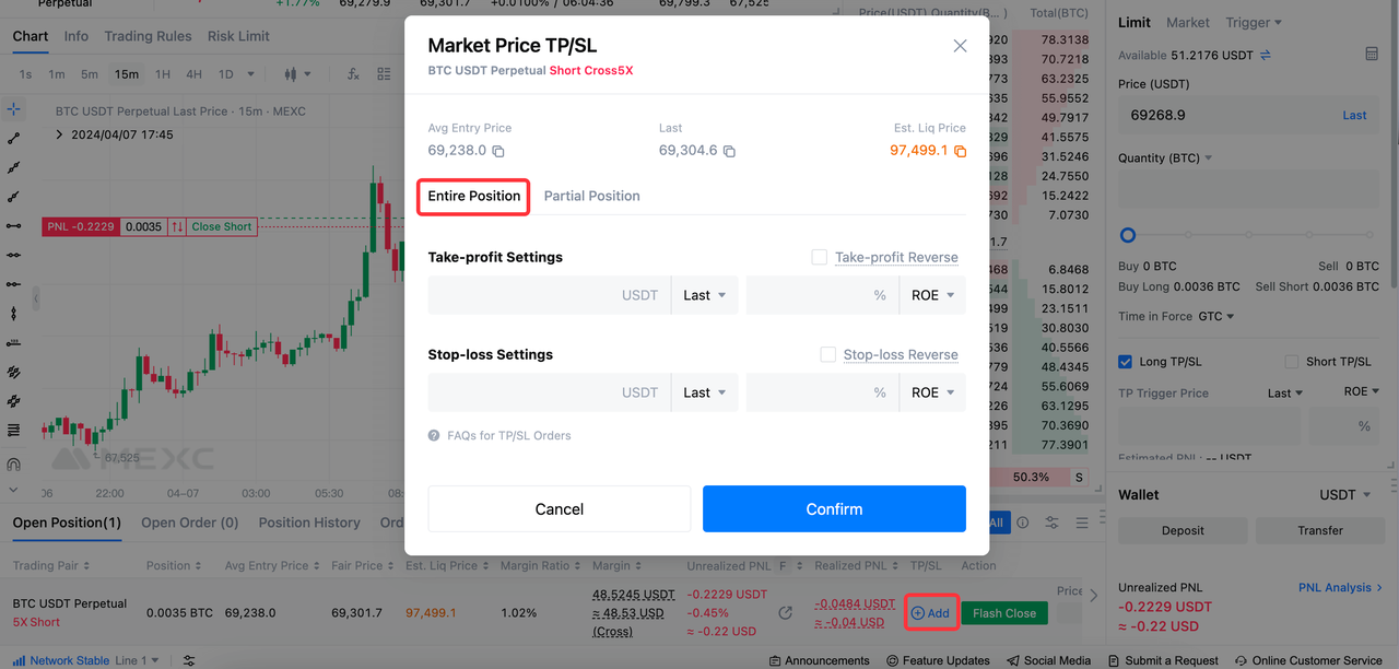 When holding a position, MEXC provides two types of TP/SL options: Entire Position and Partial Position (Web).