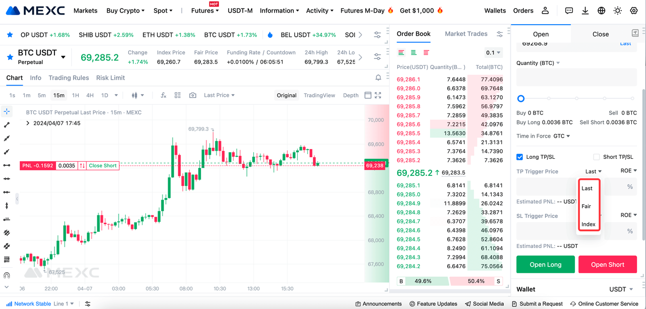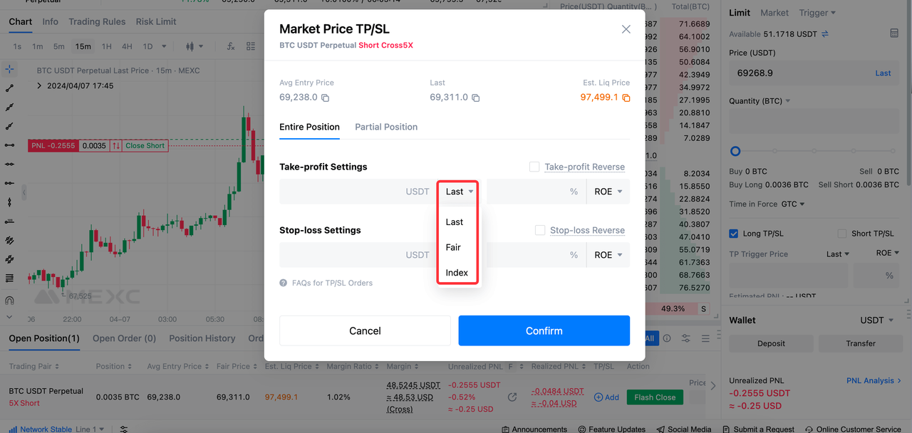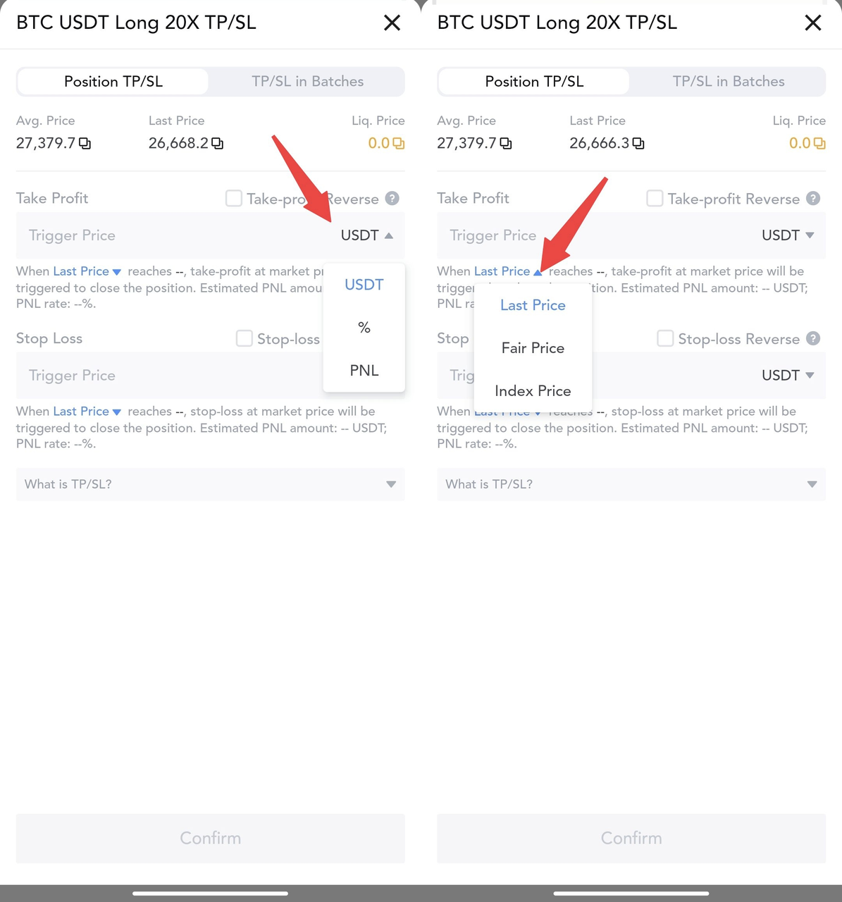 Step 2: In TP/SL Settings, select %, PNL, or USDT, along with Last Price, Fair Price, or Index Price.