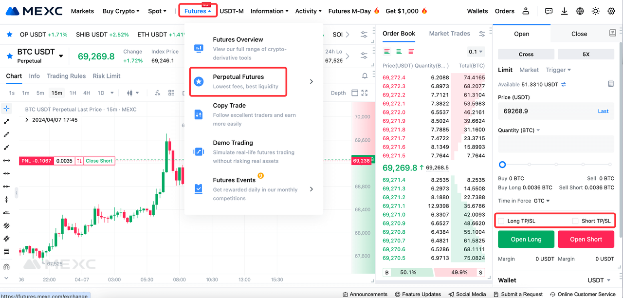 Step 1: Go to the MEXC official website, enter the Futures trading page, and set TP/SL inside the trading interface.