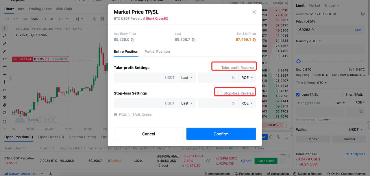IfTake-Profit Reverse is selected when setting TP for a position, the system will open a market order in the opposite direction with the same quantity after the entire position is closed upon the TP trigger. Due to market volatility, the reverse order may not be fully filled. In such cases, MEXC will notify you via email, SMS, and in-app messages.
