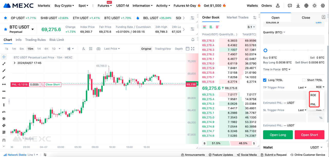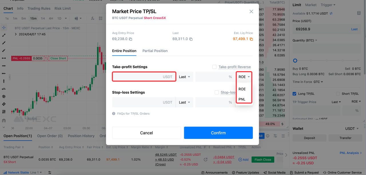 Users can choose from three setting modes: USDT (Trigger Price), ROE, or PNL. For example, if you set TP/SL by ROE, the trigger price and estimated PNL will be calculated accordingly.