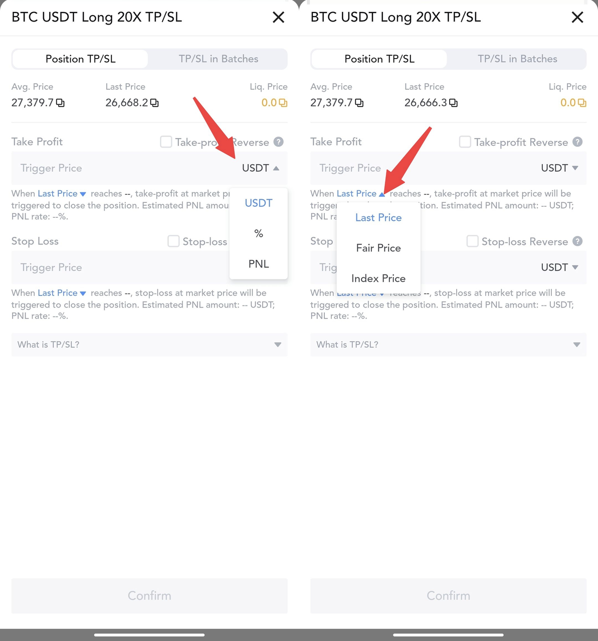Step 2: Set the TP Trigger Price (Last Price, Fair Price, or Index Price) and choose the trigger condition %, PNL, or USDT.