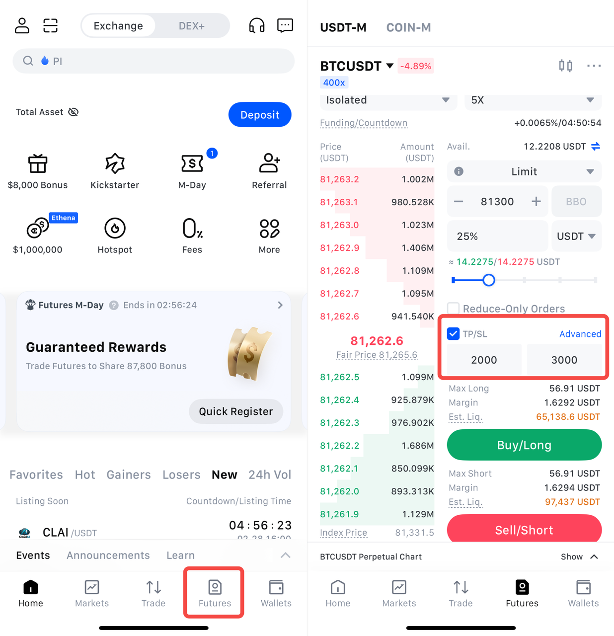 Step 1: From the MEXC App homepage, go to Futures. On the right side of the trading interface, open Advanced to set TP/SL.