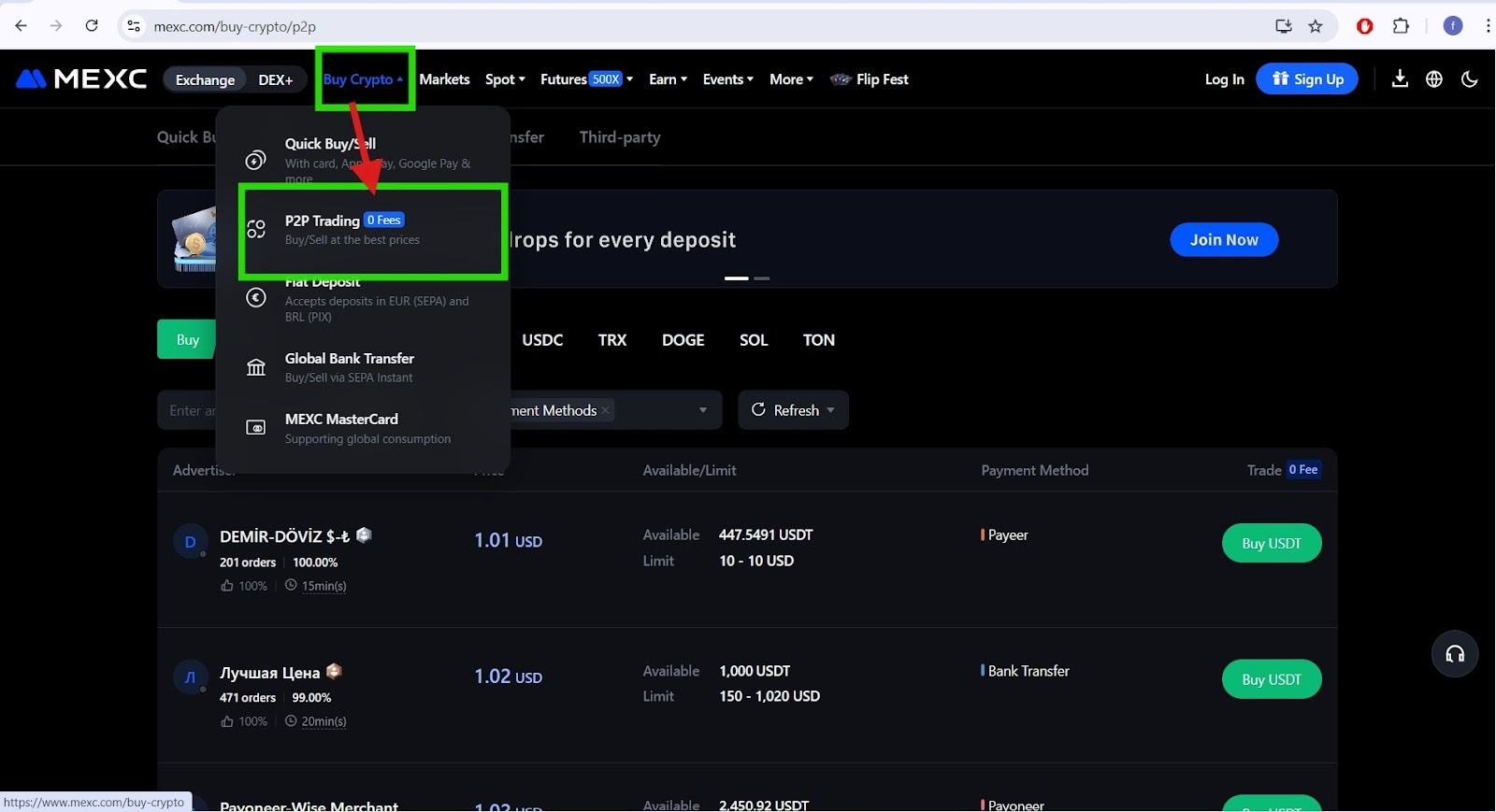 Sign Up/Log In: Create an account on MEXC using email or phone, or log in if you already have one. Access the P2P Section: Navigate to Buy Crypto → P2P Trading.