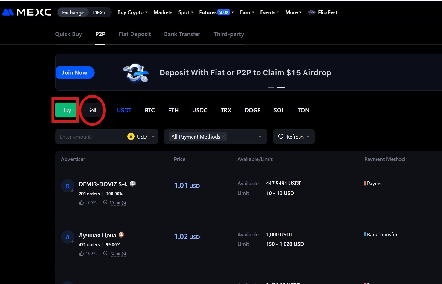 Filter Offers: Choose fiat currency, payment method, and amount; sort by best rates.