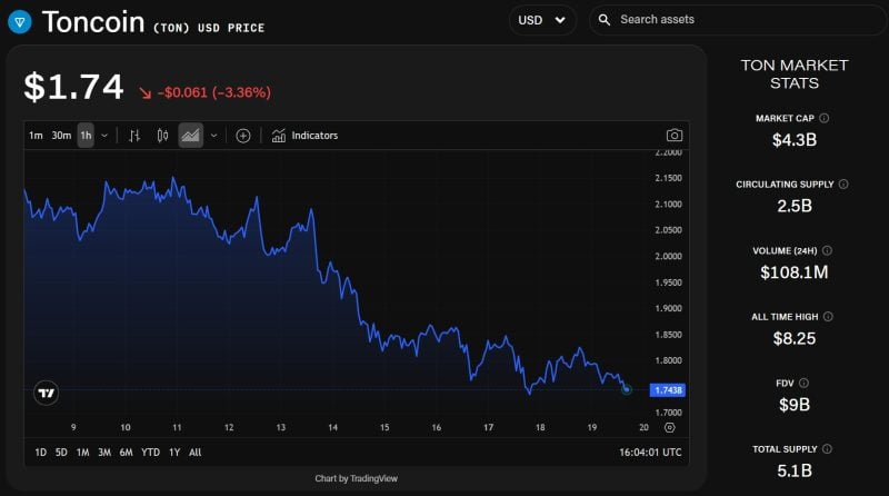 AlphaTON (ticker ATON) shares hit an all-time low of $2.86 on Tuesday before rebounding to $3.12. Toncoin itself is trading at $1.74, down more than 68% from a year ago, according to The Block's price page.