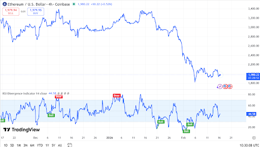 The 4-hour chart displays bullish divergence. Price made lower lows from February 10 to 14. The Relative Strength Index formed higher lows over the same period. This pattern often precedes reversals. The MACD histogram is flattening, suggesting a possible shift in momentum toward upward movement.