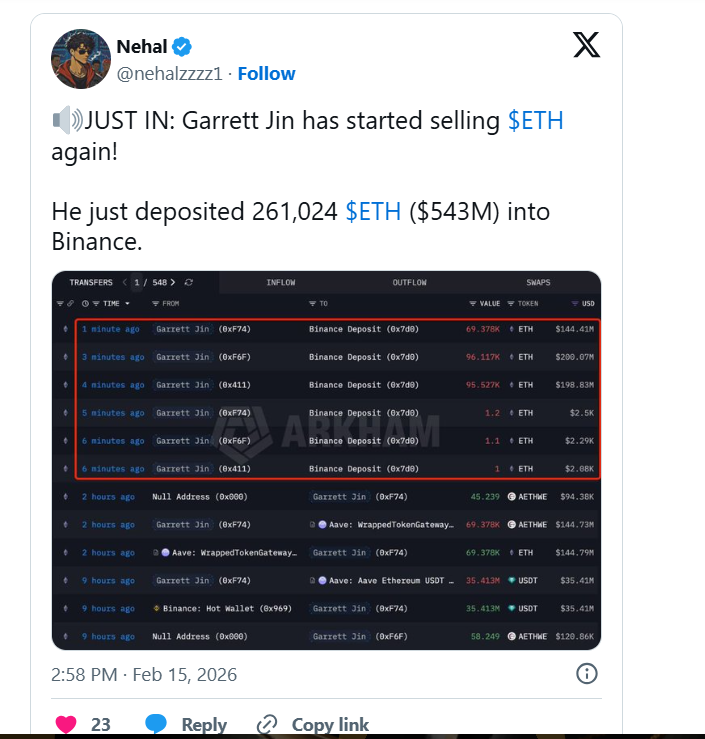 Garrett Jin has been active since the 2011 Bitcoin era. Wallets tied to the name still hold over 800,000 ETH. The recent transfers represent a significant portion of past holdings. Earlier in February, Vitalik Buterin also sold ETH during a sharp dip. Those sales weakened sentiment further.