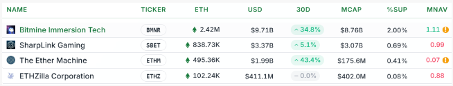 PANews reported on September 27 that according to data from Strategythreserve, as the price of ETH fell, the mNAV indicators of the three Ethereum treasury companies, SharpLink, The Ether Machine and ETHZilla, have all fallen below 1, reaching 0.99, 0.07 and 0.88 respectively. The three companies' current ETH holdings are 838,730, 495,360 and 102,240 respectively.