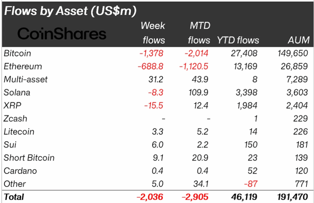 Digital asset investment products suffered significant outflows last week, with investors withdrawing a total of $2 billion, the largest weekly outflow since February 2025, according to CoinShares.