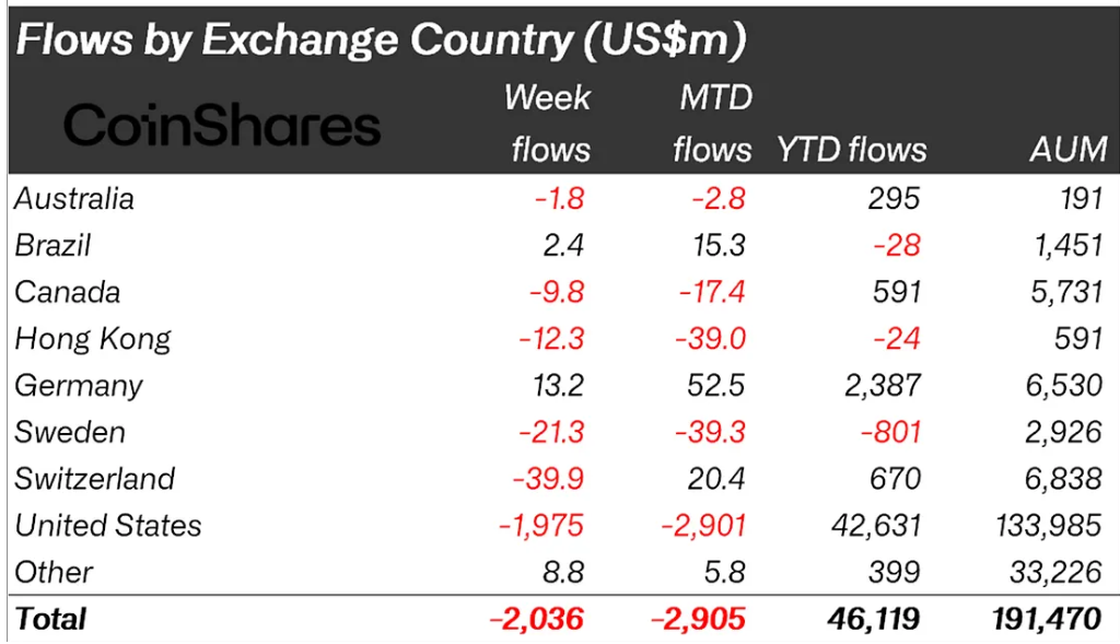 The negative sentiment was concentrated in the United States, which accounted for 97% of outflows, totaling $1.97 billion.