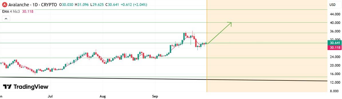 AVAX trades around $30 today. Bulls are testing $33 to $34, with a clean break opening a path toward $40. Failure to hold could revisit $28 to $26. Narrative support remains strong after a treasury rebrand signaled large capital interest in accumulating AVAX.