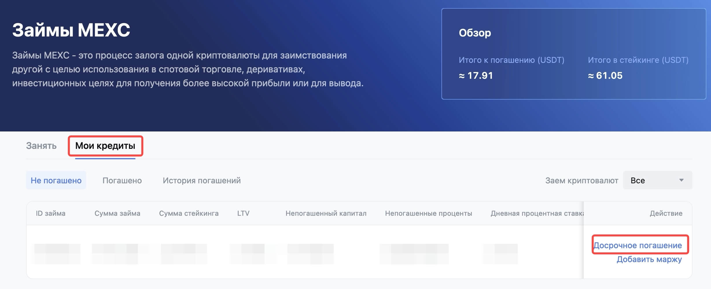 • Как только услуга досрочного погашения будет включена, пользователи, получившие заемные средства, смогут посетить страницу MEXC Займы на веб-сайте для внесения погашения.