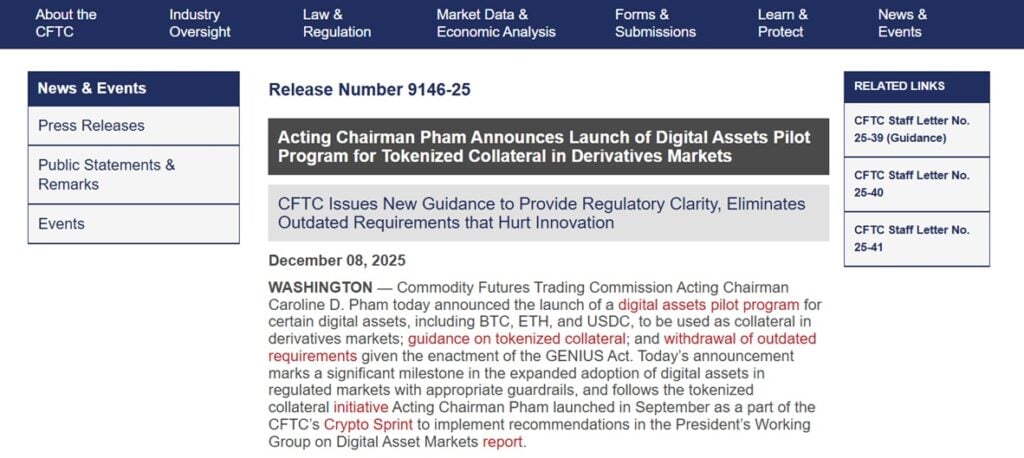 不久之後,CFTC啟動了一個試點計劃,允許Bitcoin、Ethereum和USDC作為衍生品市場中的代幣化抵押品。此舉旨在為在傳統金融中使用數字資產提供更清晰的監管框架,使機構更容易將資金轉移到加密貨幣中。