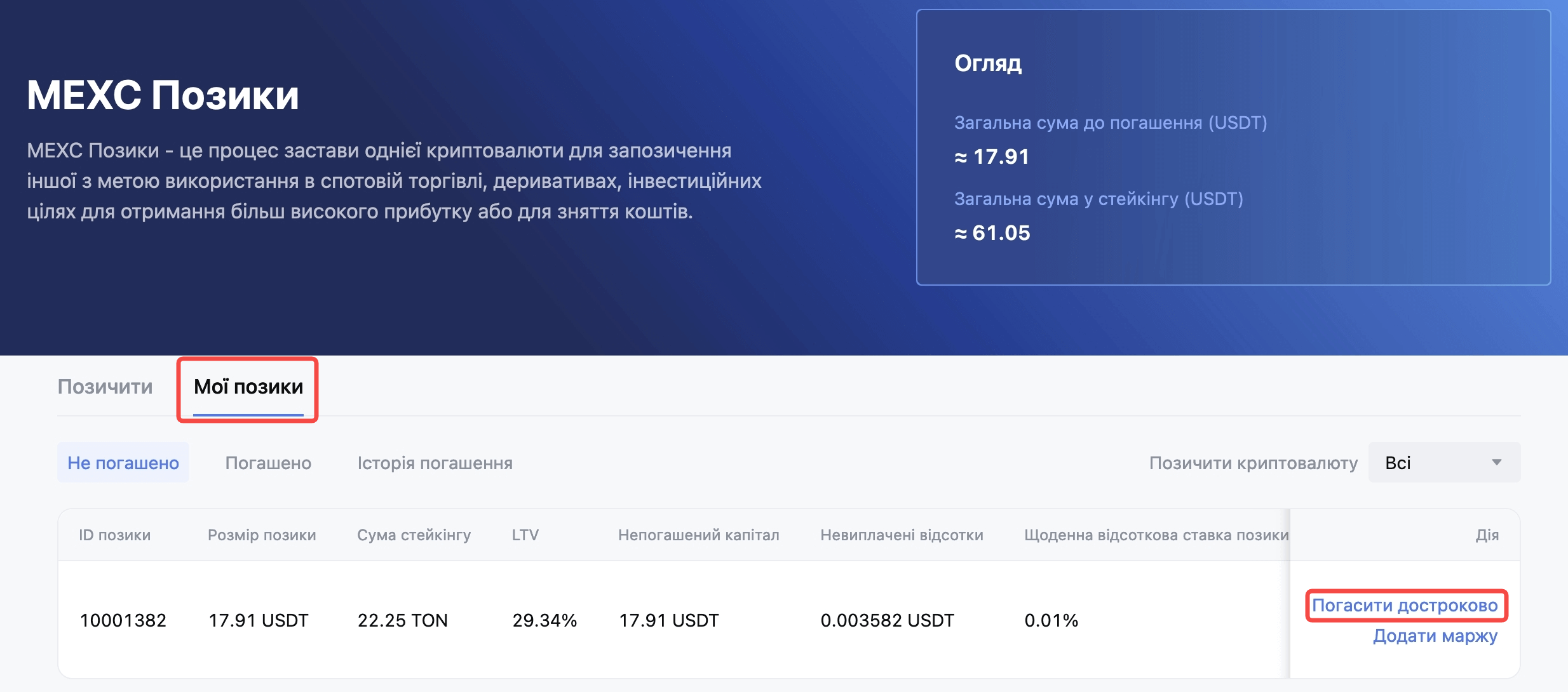 - Після ввімкнення послуги дострокового погашення користувачі, які позичили активи, можуть відвідати сторінку MEXC Позики, щоб здійснити погашення.