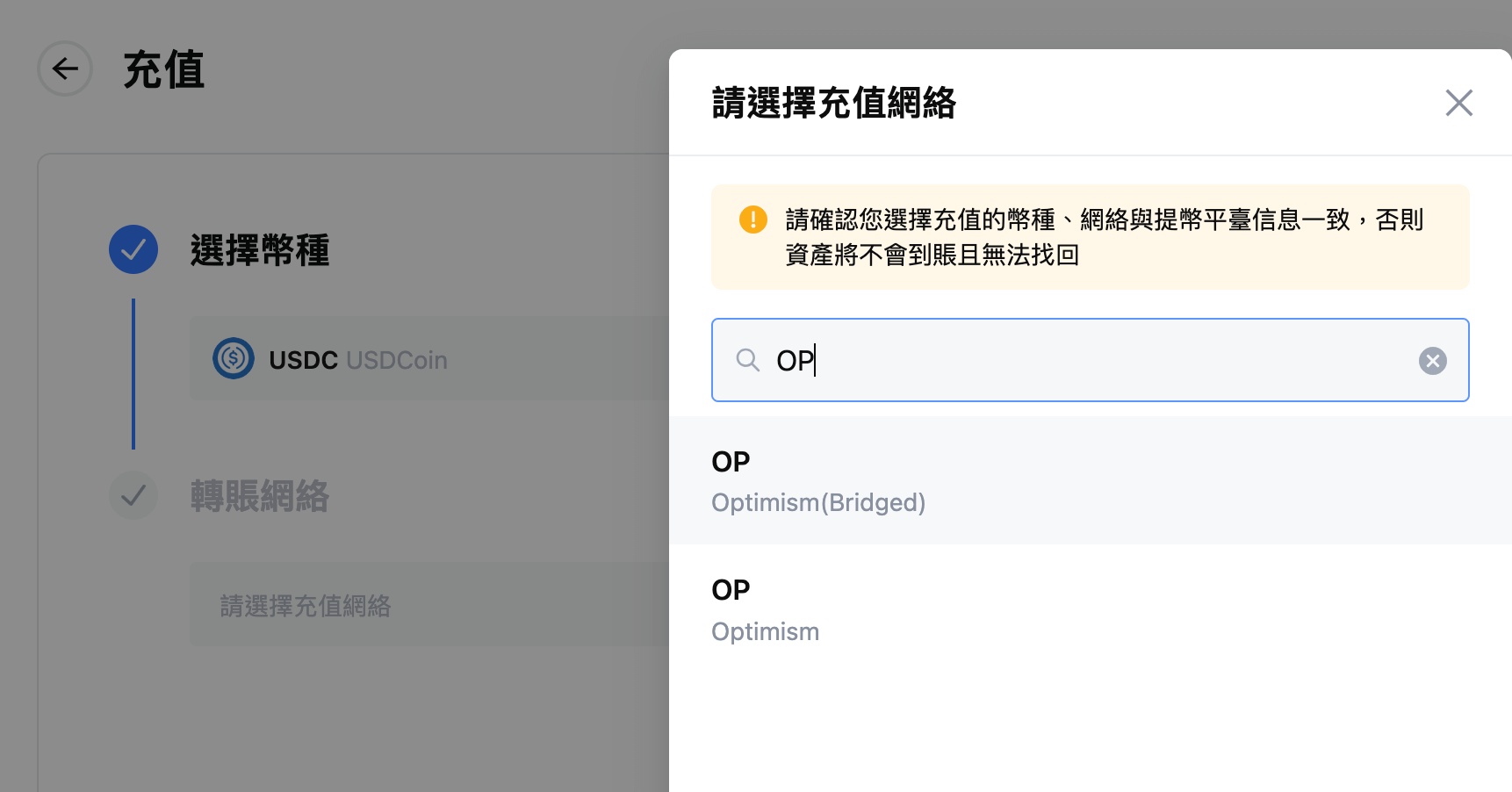 - 在充提頁面上,Optimism 網絡上原生USD Coin (USDC)代幣的網絡名稱爲Optimism。請您在充/提值前仔細確認,以免造成資產損失。