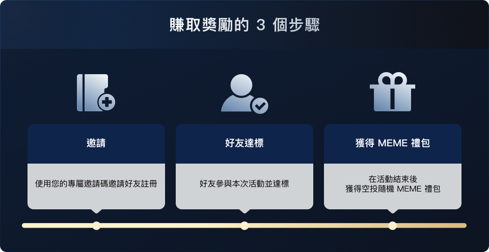 在活動期間,好友通過您的活動推薦碼成功註冊並完成上述任意任務,即可為您贏取價值 10 USDT 的隨機 Meme 獎勵禮包。每位推薦人最多可獲得 5 個獎勵禮包,獎勵先到先得!