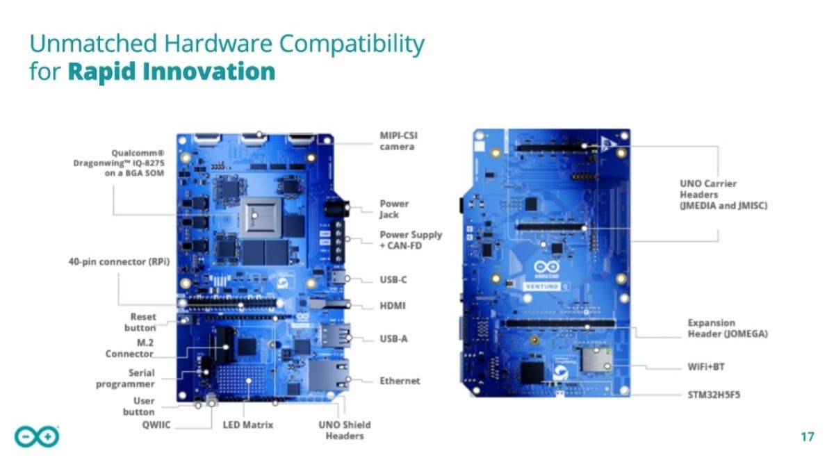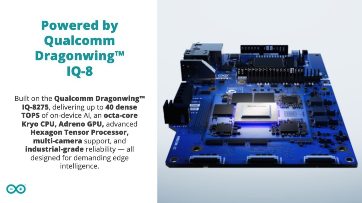 Qualcomm 攜手 Arduino 推出搭載 Dragonwing IQ-8 處理器的 VentUNO Q 開發平台,整合雙核心架構提供 40 TOPS AI 算力,售價不超過 300 美元。