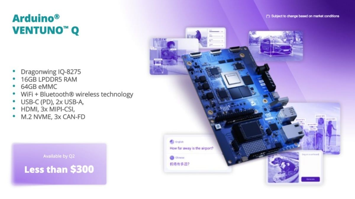 上市資訊方面,Arduino VentUNO Q開發平台的建議售價將壓在300美元以內,並且預計在今年第二季末正式對外發售。