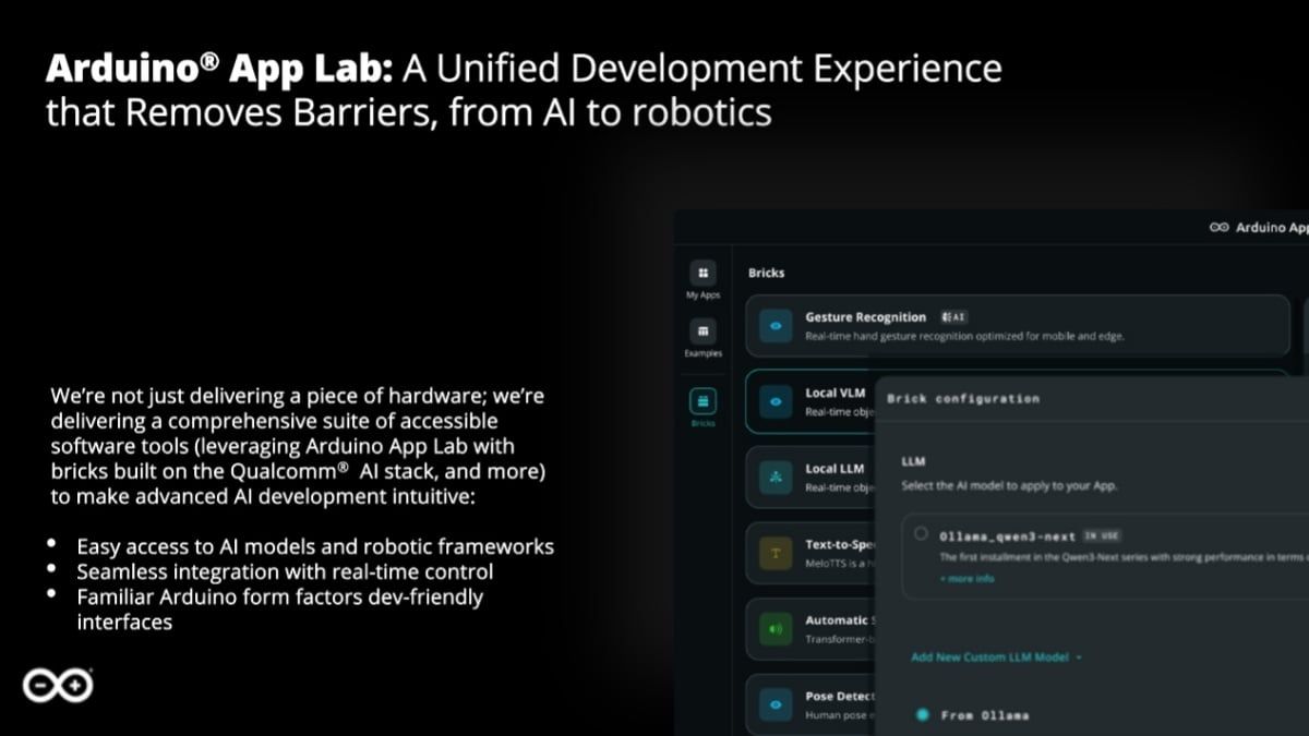 為了讓廣大的開發者社群能更快上手,Arduino延續其開源與易用性的傳統,同步推出名為「App Lab」的全新開發環境。App Lab允許開發者以類似「積木拼接」的視覺化方式,快速組合、建立包含電腦視覺、語音辨識等功能的AI應用程式。這種高度整合的軟硬體生態系統,讓即使是不具備深厚底層驅動編寫經驗的創作者或工程師,也能迅速將AI概念轉化為實際產品。